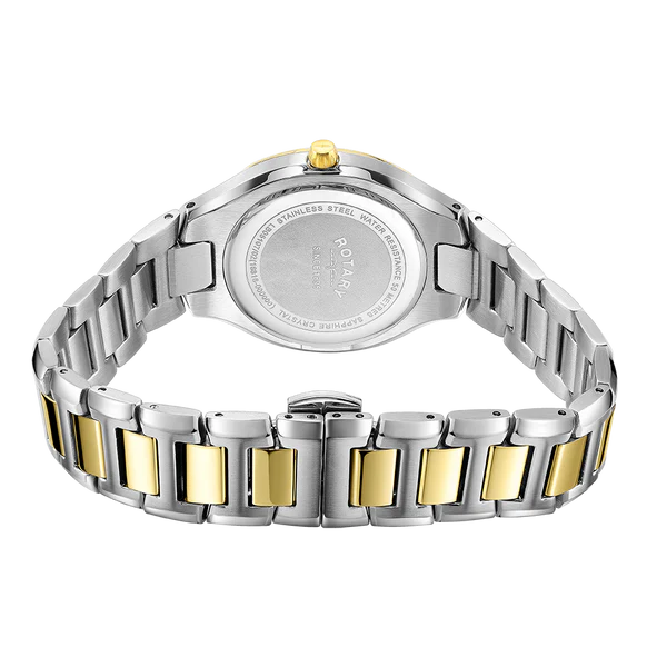 Reimagined and refined, the ladies Rotary Contemporary carries a fluid form that wraps around the wrist elegantly; featuring a 32mm dial with refined cushion case, and an integrated H-link bracelet in two-tone PVD stainless steel. Its elegant dial features applied facetted indexes and a date window at six, shielded by high quality, scratch resistant Sapphire glass. Water resistant to 50m and powered by a highly reliable quartz movement, this new generation of Contemporary makes the perfect accessory for any outfit.