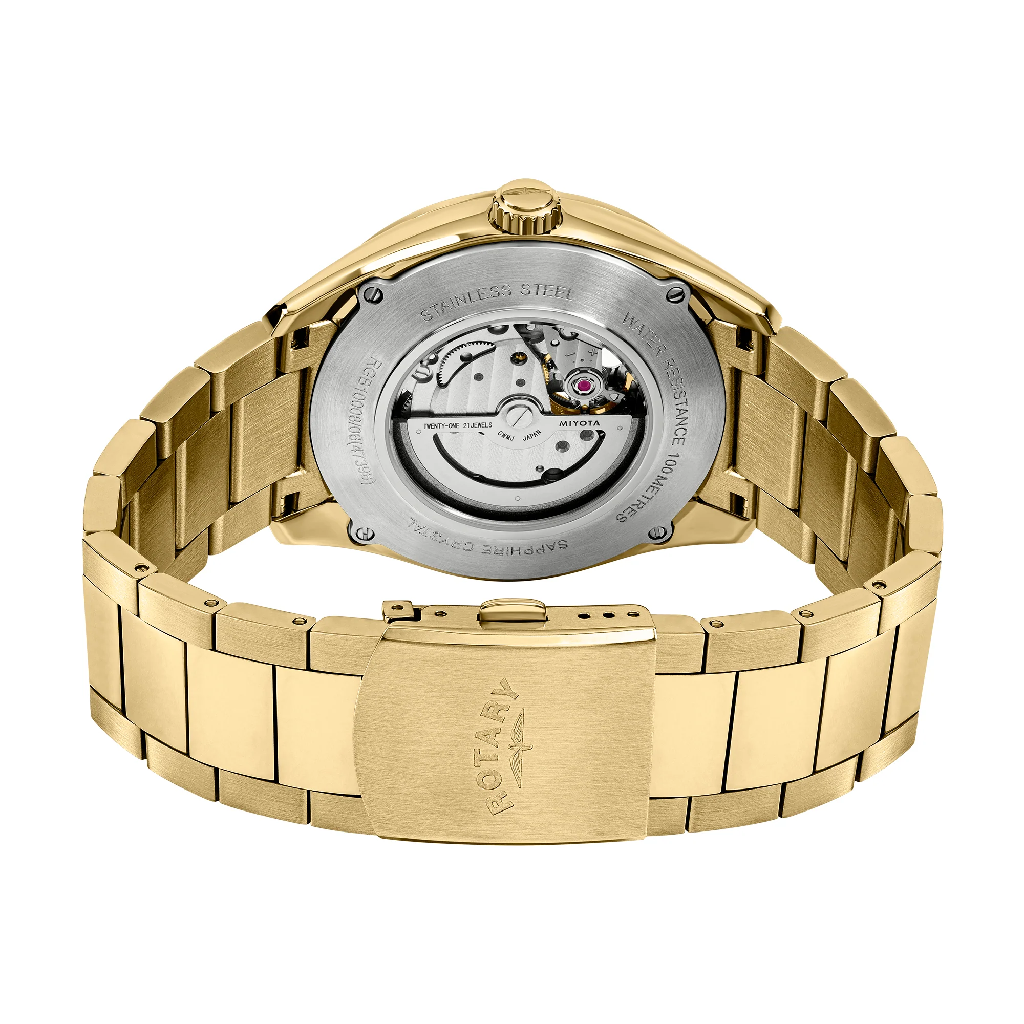 Polished rose-tone markers and hands contrast beautifully against the partially open-worked dial, while the 3-link gold PVD stainless steel bracelet effortlessly continues the case design. Designed for the discerning watch enthusiast, the Rotary Seamatic Eclipse balances modern watchmaking with timeless style.