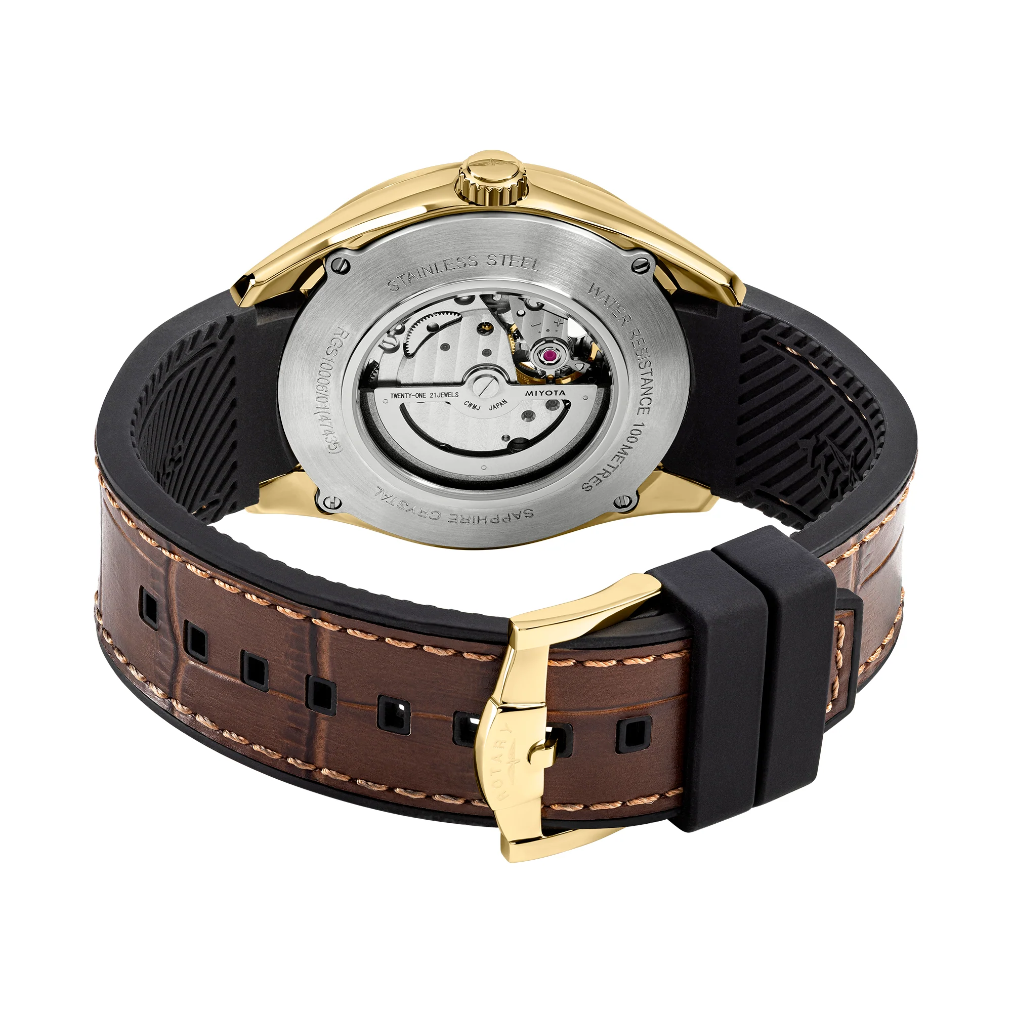 Unveil the inner workings of time with the striking Rotary Seamatic Eclipse. Framed in a bold gold-tone case, this watch features an intricately skeletonised dial that offers a window into the self-winding mechanical movement beneath. The inclusion of an exhibition caseback allows for a glimpse into the back of the movement and the rotor.