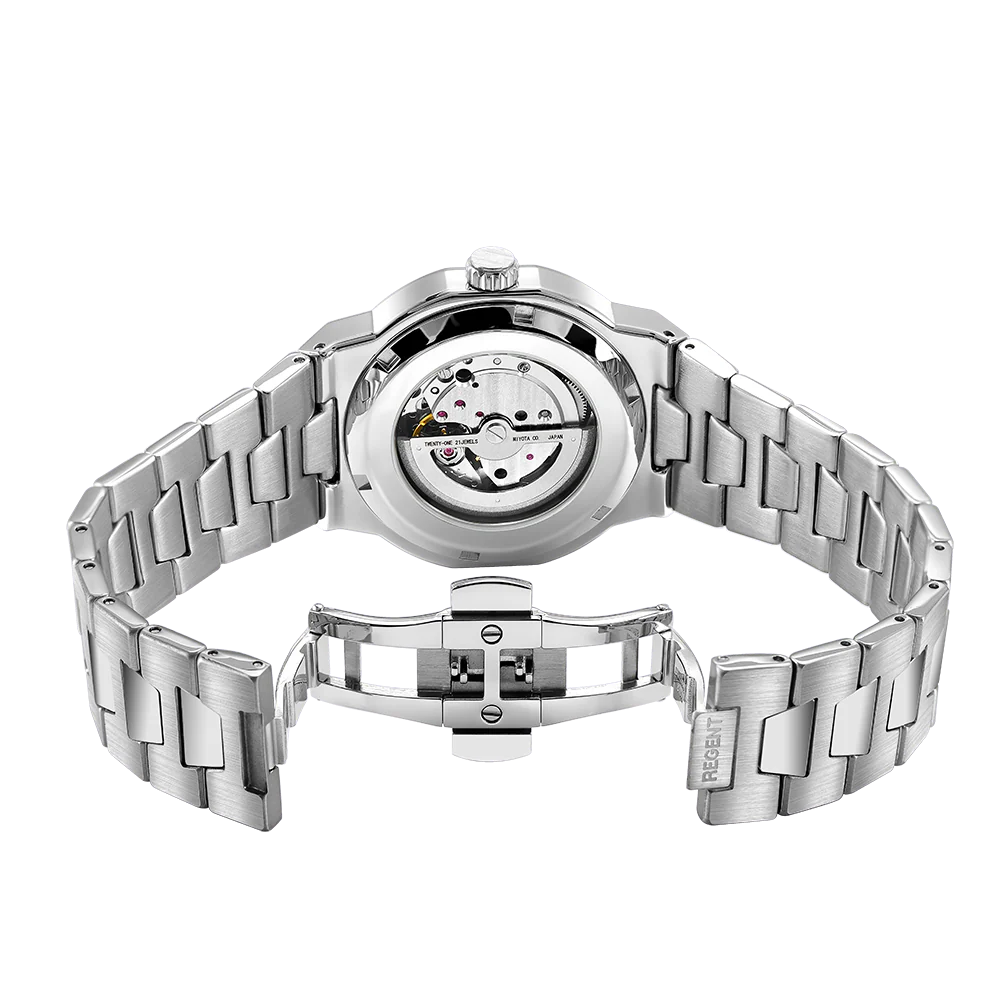 The epitome of powerful design, this Skeleton's trademark look is a multi-facetted brushed stainless steel 40mm case housed within a circular dial and mounted on an integrated tapered h-link bracelet. The watch showcases an enchanting skeleton dial that features applied blue luminous hour markers and a striking cage structure. Water resistant to 100m, the impactful Skeleton is powered by a self-winding movement that makes it perfect for everyday use. With quality and durability at the forefront of design, this watch is made with scratch resistant sapphire glass.