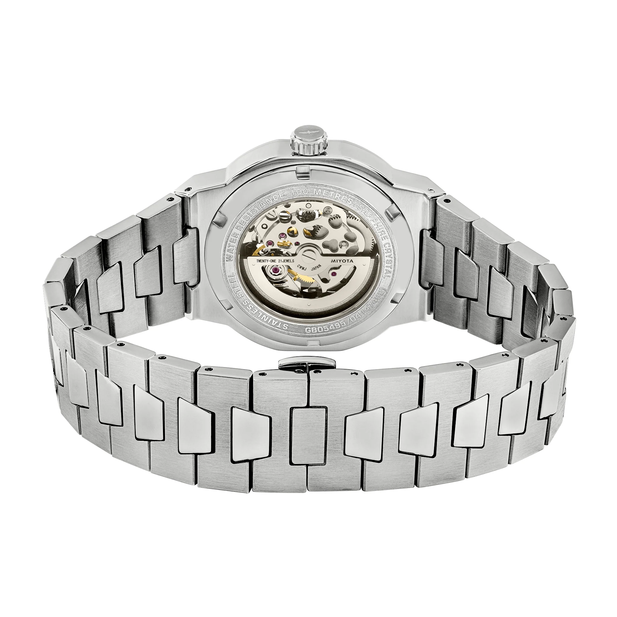 The angular nature of the case allows light to reflect purposefully off of its edges, delivering a shimmering effect that travels down across the integrated bracelet.