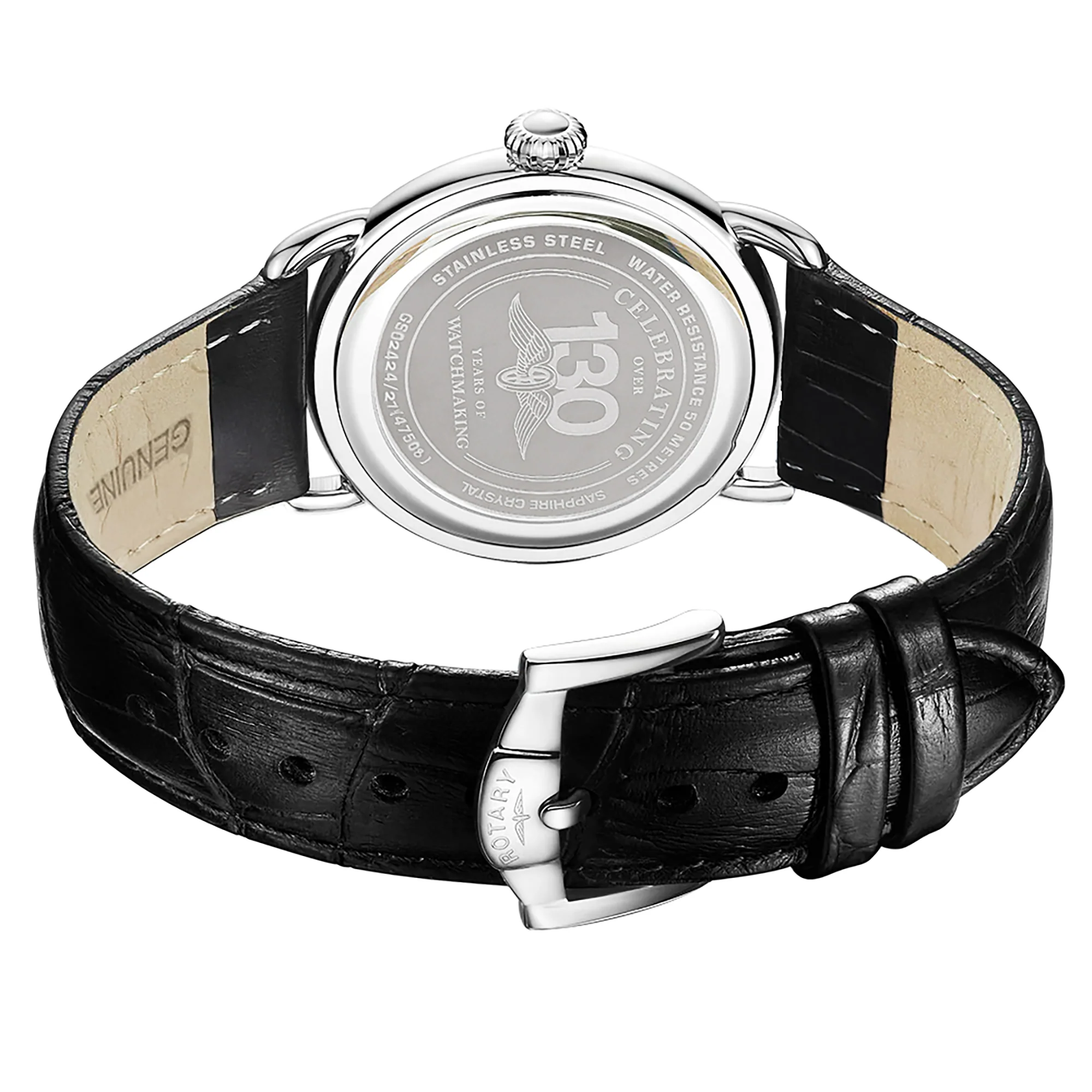 Completing the design is a black genuine leather strap and classic Rotary buckle and sapphire glass for enhanced durability.