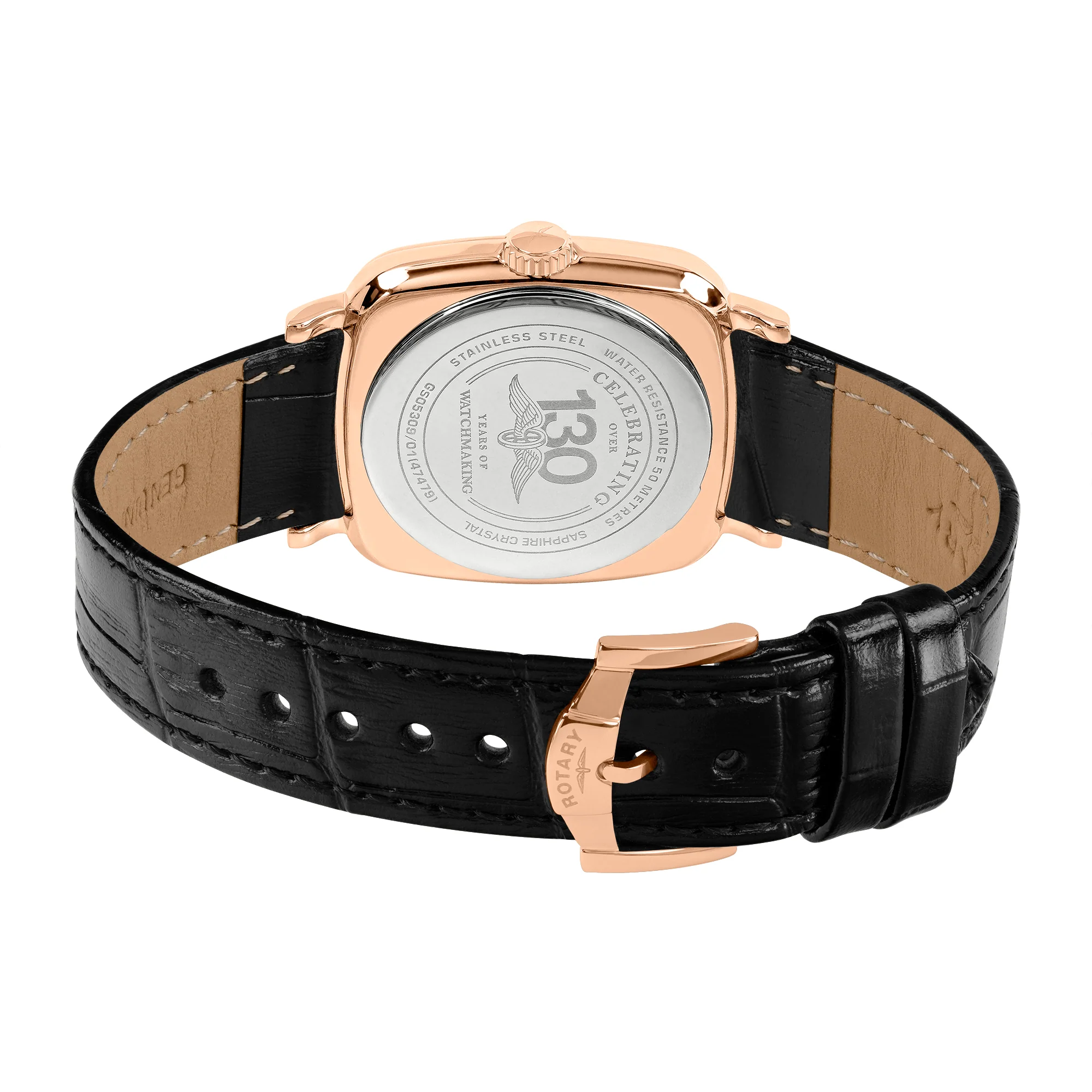 Featuring a classic cushion case design, minimal lugs and a bold guilloche dial, this watch delivers plenty of vintage inspired charm. The 37mm rose gold PVD stainless steel case gives a well rounded presence on the wrist, without being overbearing. The watch is completed with a supple genuine black leather strap and Rotary buckle.