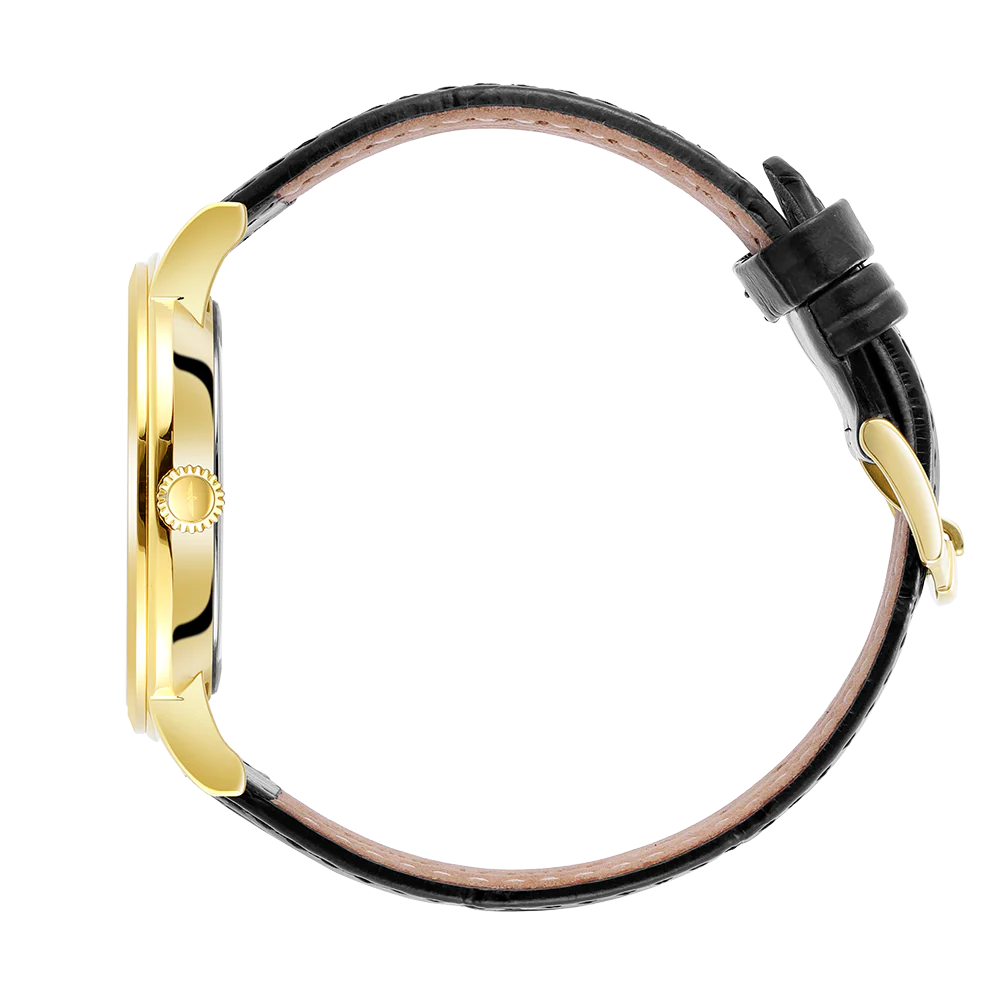 A genuine black leather strap and water resistance of 50m ensures all day wearability. This classic watch is powered by a reliable quartz movement featuring a day/date complication for added practicality.