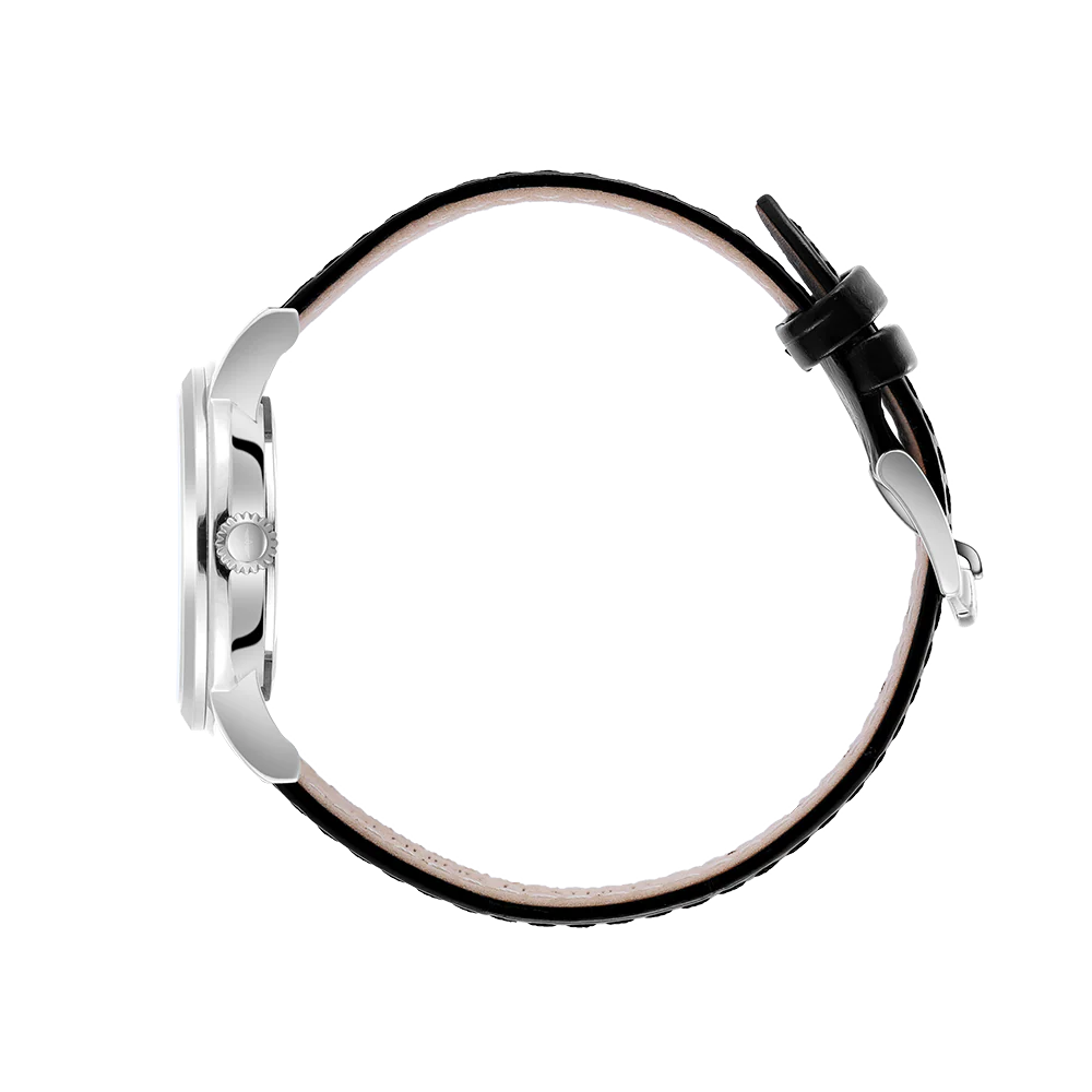 Exquisitely fashioned from premium stainless steel and resilient sapphire glass, this Rotary Heritage timepiece exhibits refined Roman numerals against a pristine white guilloche dial, enhanced by intricate radial and peripheral stitching details. The authentic black leather band delivers exceptional comfort for all-day wear.
